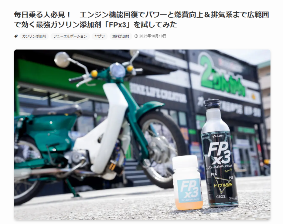 2025年10月10日バイク総合情報サイト「Moto Megane(モトメガネ)」様にて 弊社製品である燃料添加剤「フューエルポーション3」が紹介されました! ぜひ以下の記事をご覧ください。 ▼掲載記事はこちらから! 毎日乗る人必見! エンジ […]