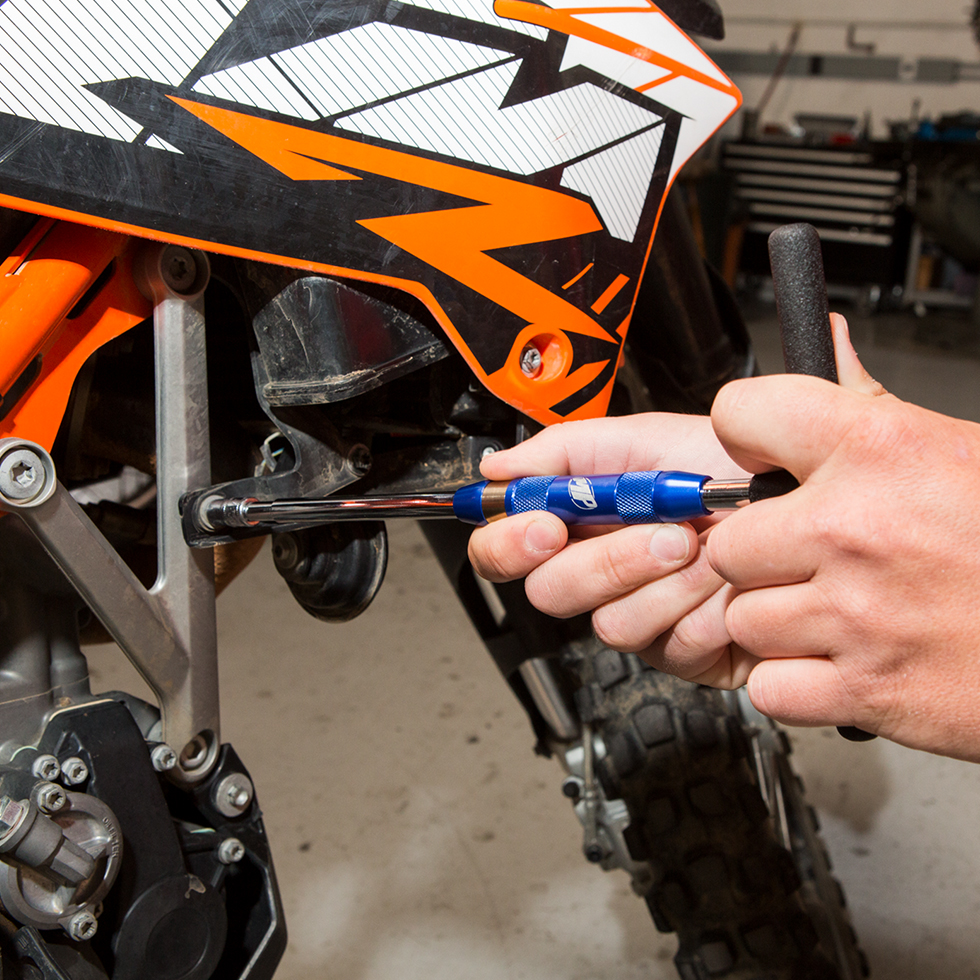 クルクル回せるスピナー付きTハンドルで、ボルト&ナットの着脱がスピーディー!スイベル&固定の2段階ドライブで使い勝手◎。タフなクロムバナジウム鋼に、ブルーアルマイトのスピナーがオシャレ!滑り止めパッドで握り心地も快適。モーションプロロゴのレーザー彫刻入り!