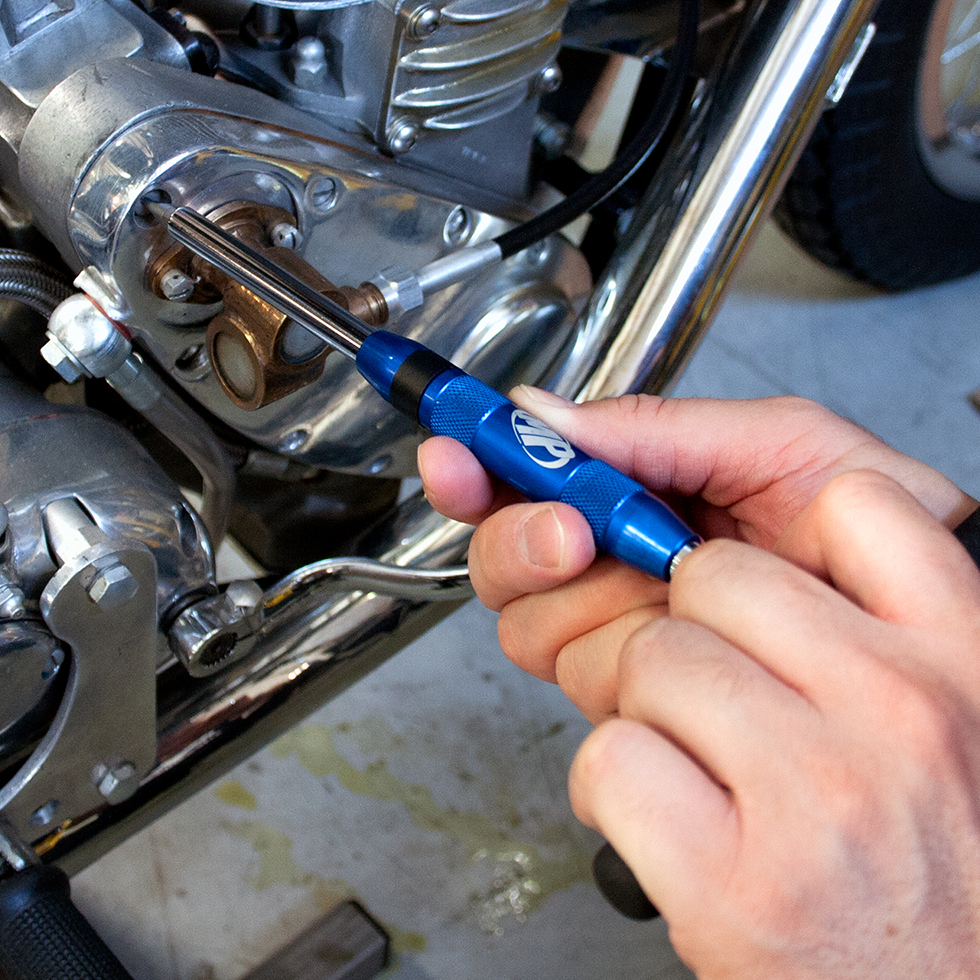 クルクル回せるスピナー付きTハンドルで、ボルト&ナットの着脱がスピーディー!スイベル&固定の2段階ドライブで使い勝手◎。タフなクロムバナジウム鋼に、ブルーアルマイトのスピナーがオシャレ!滑り止めパッドで握り心地も快適。モーションプロロゴのレーザー彫刻入り!