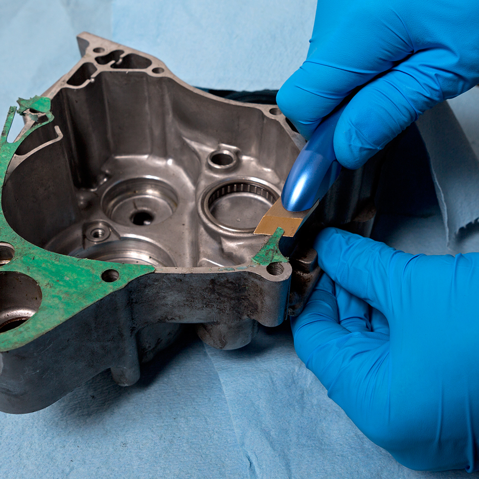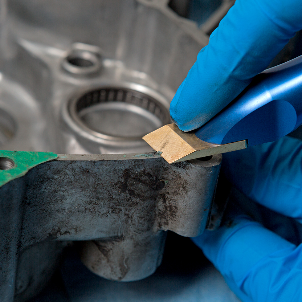 ◆ 真鍮製の刃が、アルミ製エンジンケースからペーパーガスケットを安全に剥がします。