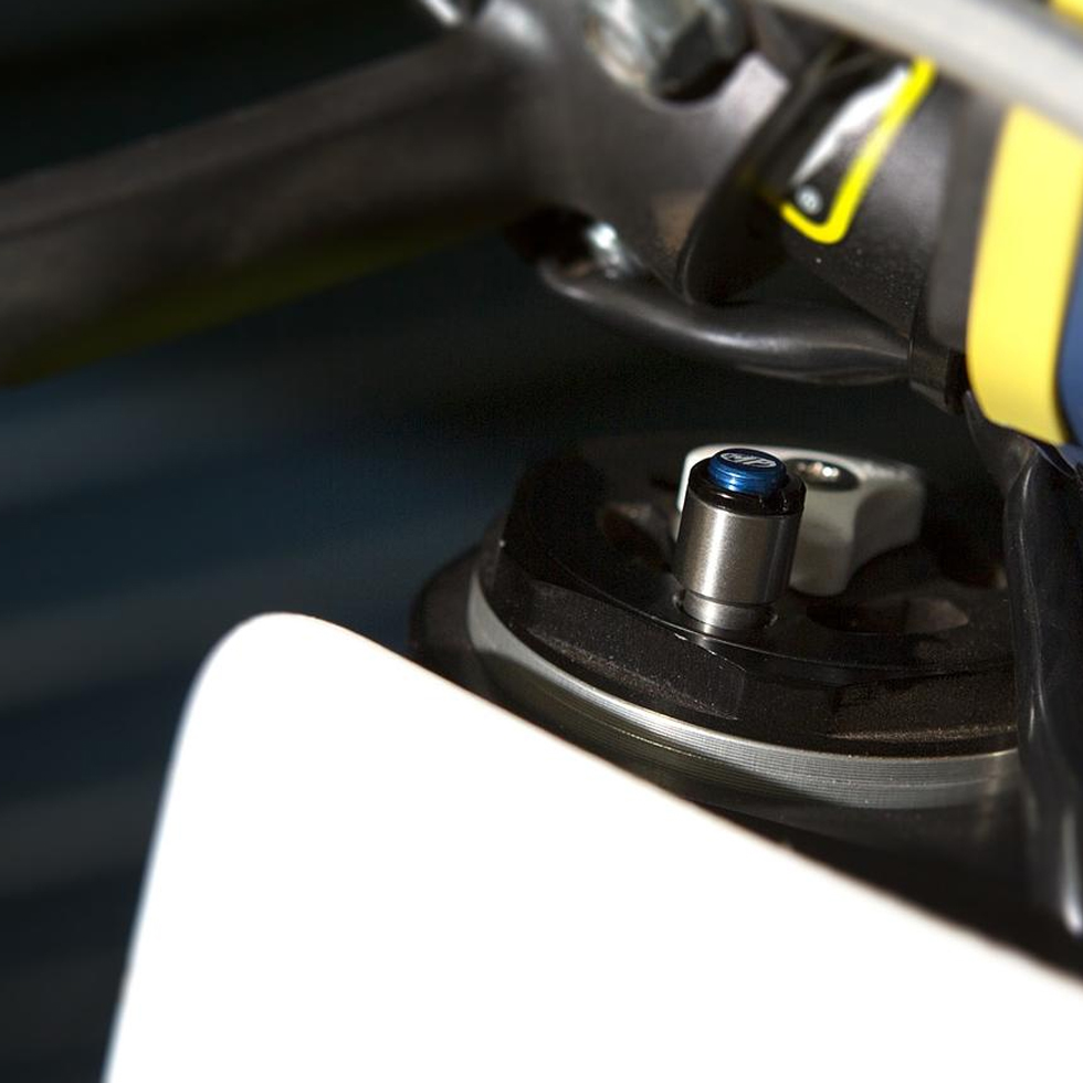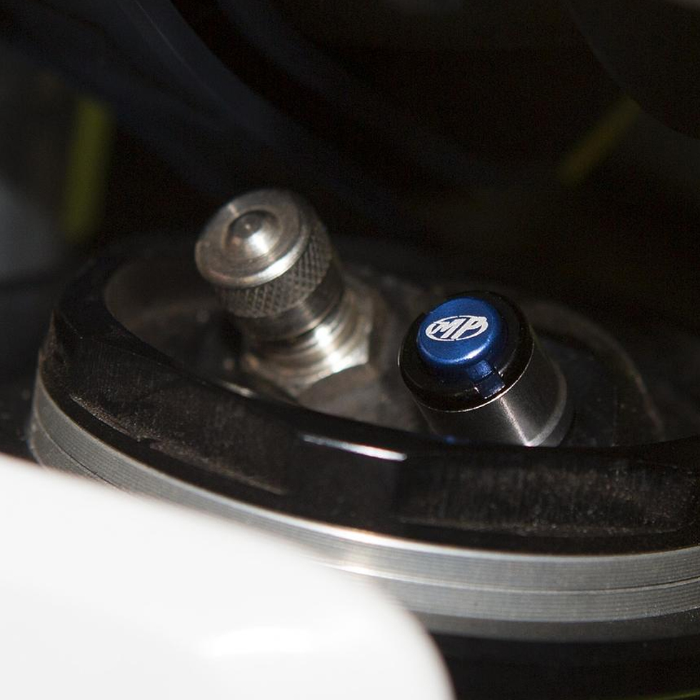 ◆ フロントフォークが伸びきった状態(フロントタイヤを浮かせてフォークが伸びきった状態)でブリーダー先端のボタンを押すと、フォーク内の内圧が大気圧に調整されます。