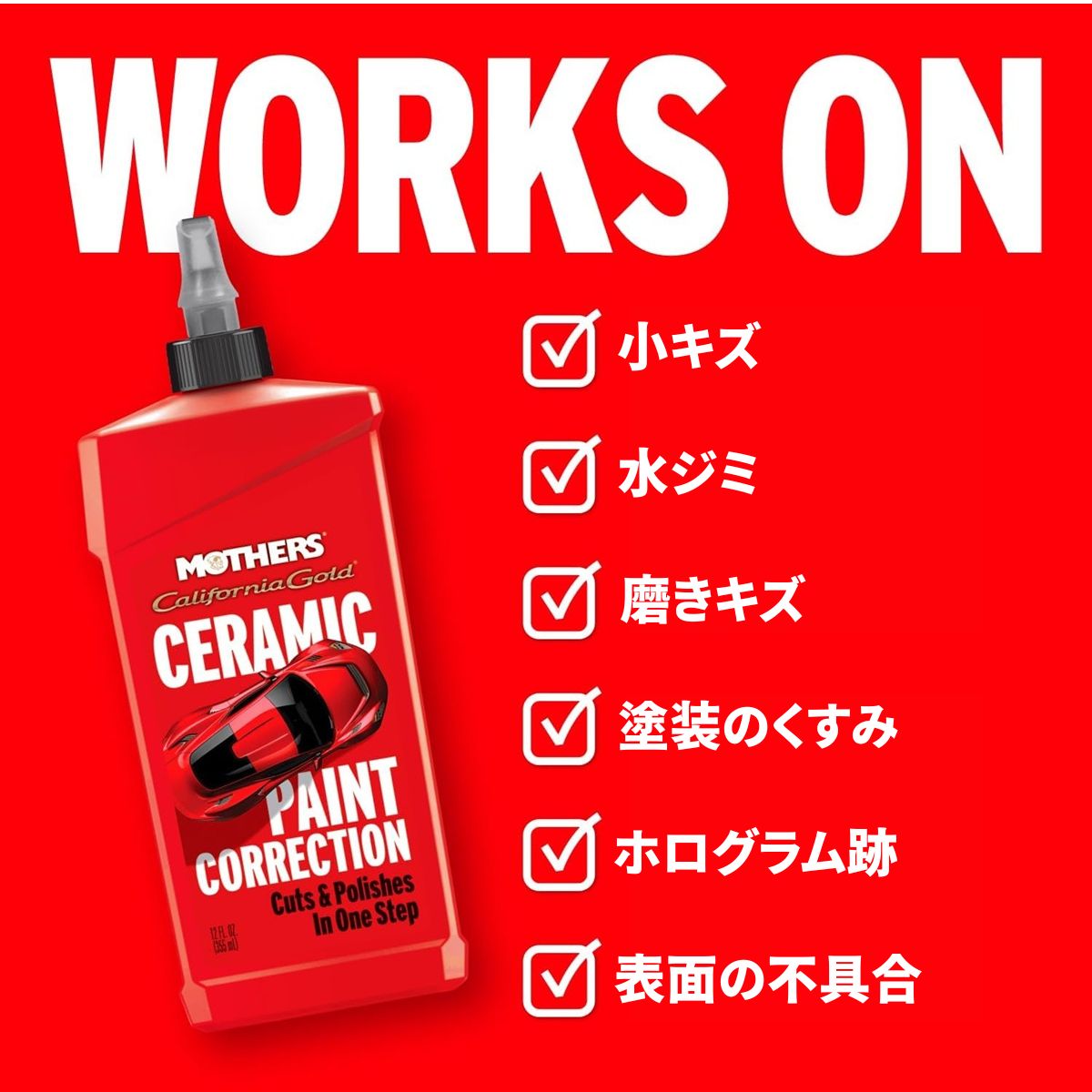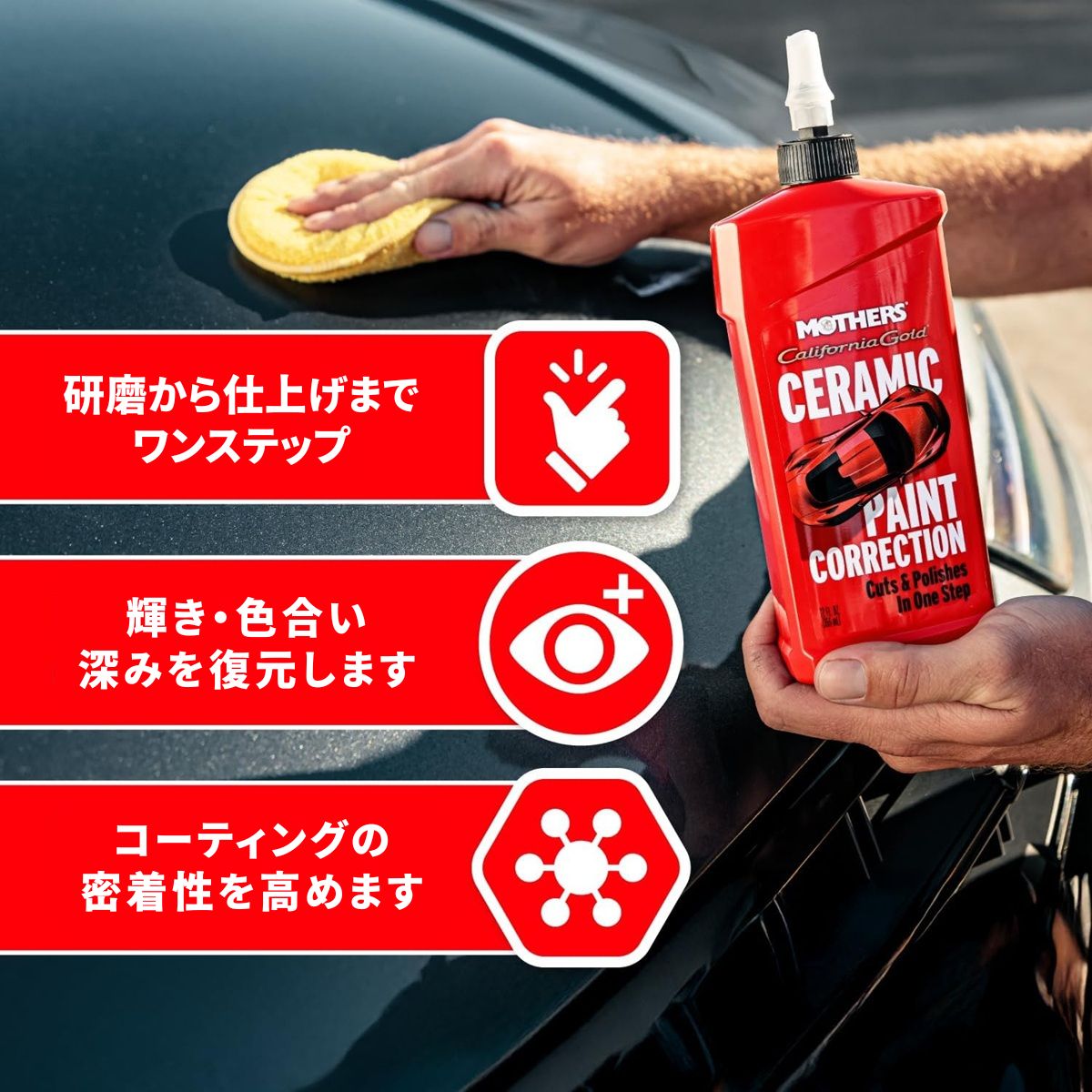 Mothers セラミックペイントコレクションは、洗車やワックスがけでは落とせない塗装面の傷や酸化、水垢を解消し、塗装面の輝きを復活させる特別なコンパウンドです。