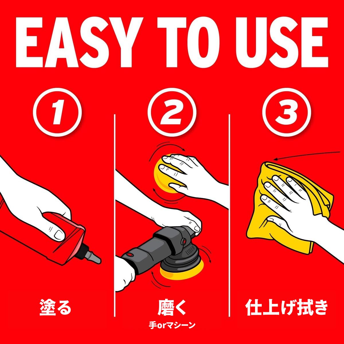 ・クリア塗装された自動車塗装用です。未塗装樹脂、マット塗装、つや消しラッピングフィルム等には使用しないでください。